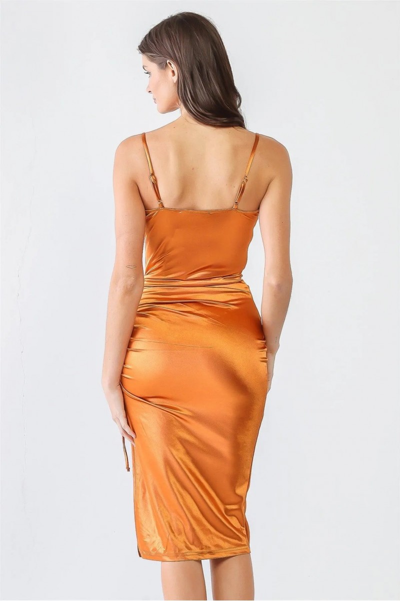 - Product Code: Rust Satin Strappy Ruched Side Slit Midi Dress